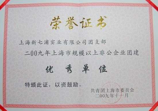 2009年11月,上海新七浦实业有限公司团支部荣获“二00九年上海市规模以上非公企业团建优秀单位”称号
