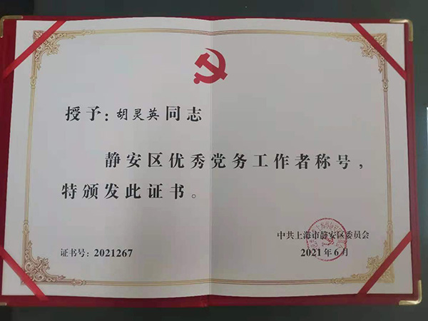 新七浦党支部书记胡灵英同志荣获静安区优秀党务工作者称号。
