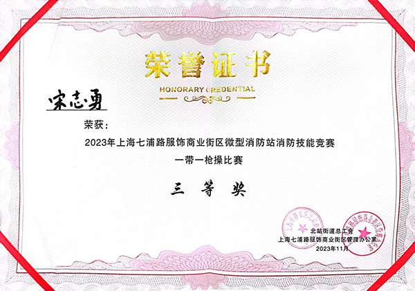 6、“不断提升团队战斗力”是新七浦保安部一贯坚持的优秀作风,2023年11月9日,在“2023年上海七浦路服饰商业街区微型消防站消防技能竞赛”中,该部门员工屡获佳绩其中,田志永同志荣获一等奖,林敏、胡云合同志荣获二等奖,宋志勇同志荣获三等奖。